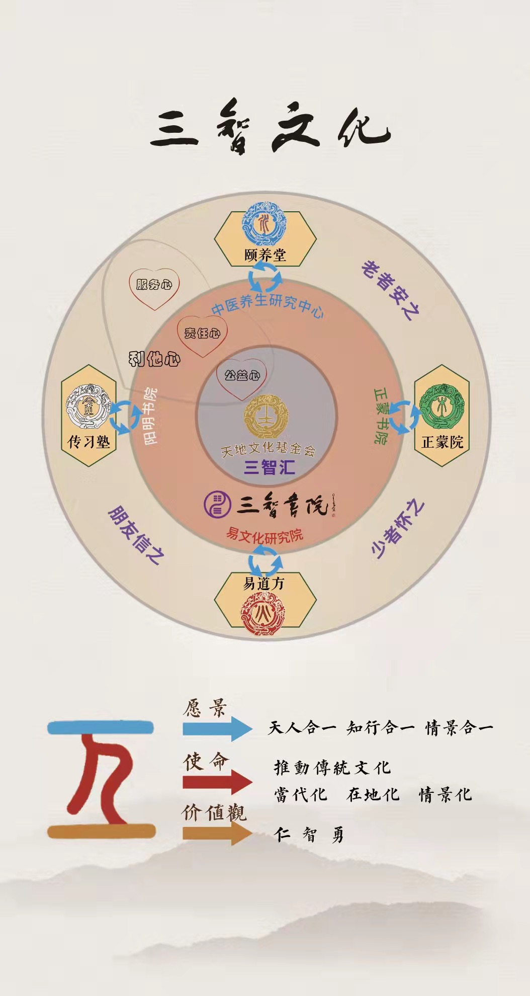 三智汇是三智文化体系中的秉持公益属性的组成部分,并且与三智文化体系具有一致性的愿景、使命、价值观。